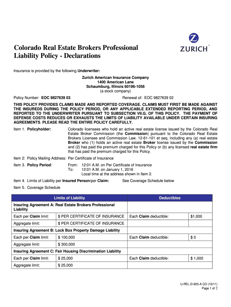 Colorado Real Estate Brokers Professional Liability Policy Declarations Insurance is provided by the following Underwriter: Zurich American Insurance Company 1400 American Lane Schaumburg, Illinois