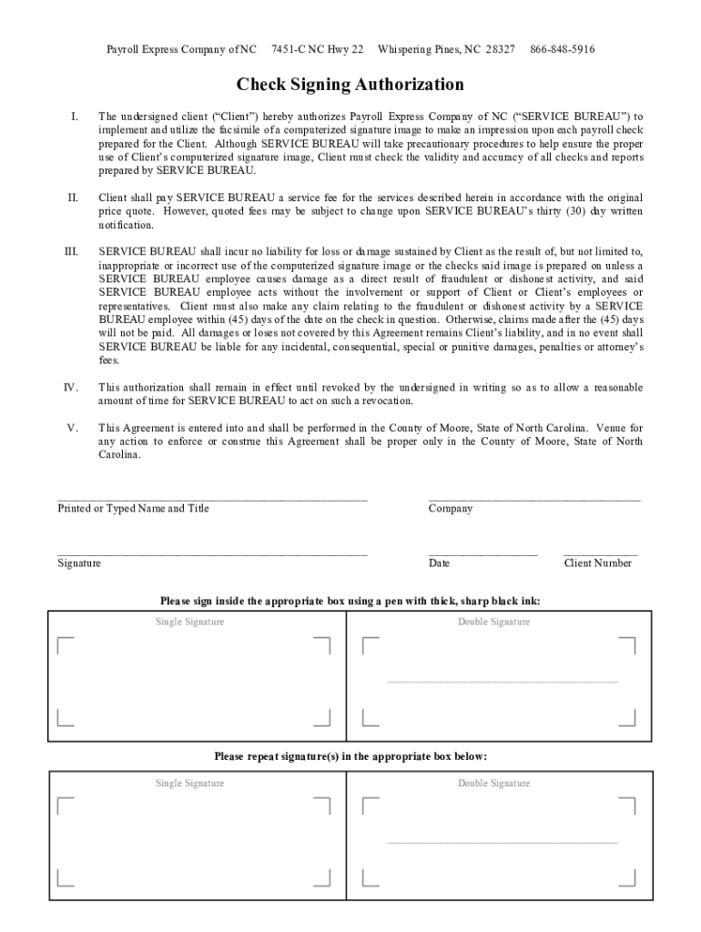 Payroll Express Company of NC7451C NC Hwy 22Whispering Pines, NC 283278668485916Check Signing Authorization