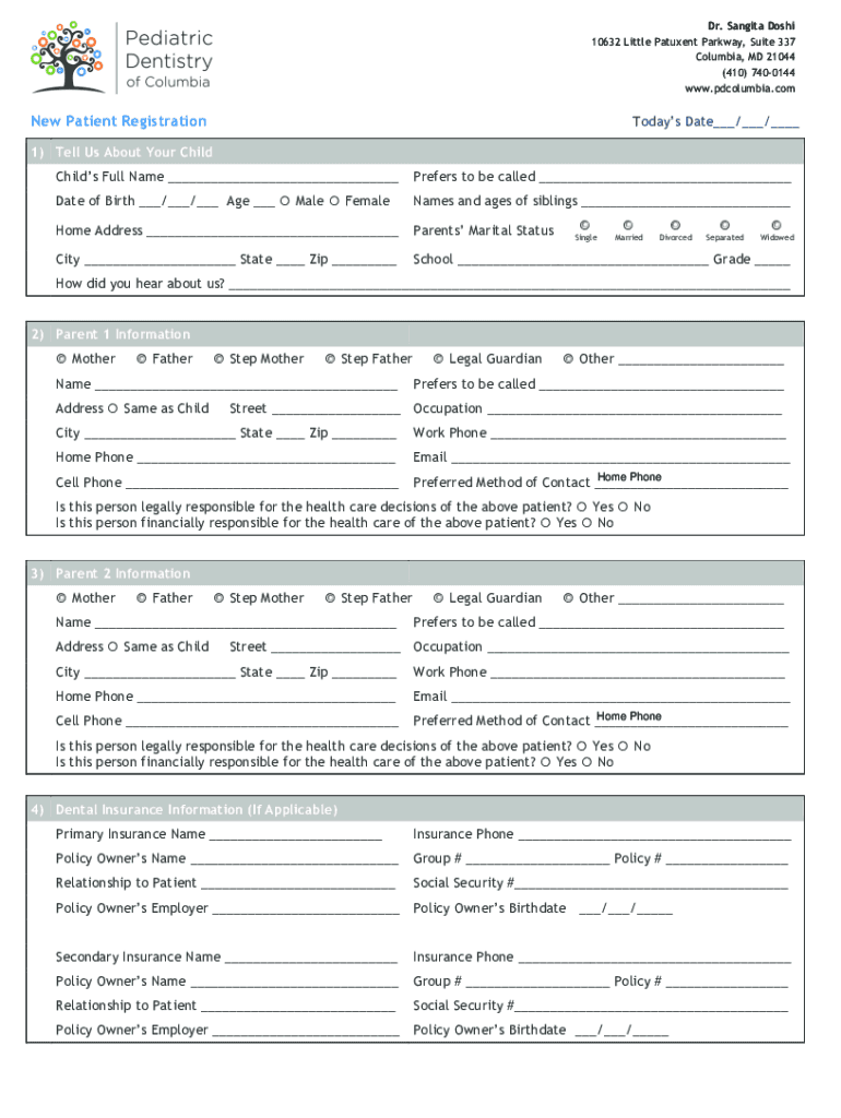 Dr. Santa Dosh 10632 Little Patent Parkway, Suite 337 Columbia, MD 21044 (410) 7400144 www.pdcolumbia.comNew Patient RegistrationTodays Date / / 1) Tell Us About Your Child's Full Name Prefers to