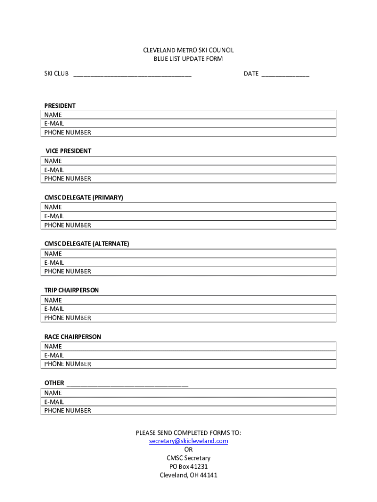 CLEVELAND METRO SKI COUNCIL BLUE LIST UPDATE FORM SKI CLUB PRESIDENT NAME EMAIL PHONE NUMBER VICE PRESIDENT NAME EMAIL PHONE NUMBER MSC DELEGATE (PRIMARY) NAME EMAIL PHONE NUMBER MSC DELEGATE (ALTERNATE)