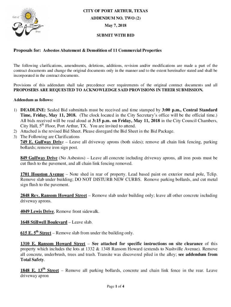 CITY OF PORT ARTHUR, TEXAS ADDENDUM NO. TWO (2) May 7, 2018, SUBMIT WITH Proposals for: Asbestos Abatement & Demolition of 11 Commercial Properties The following clarifications, amendments, deletions,