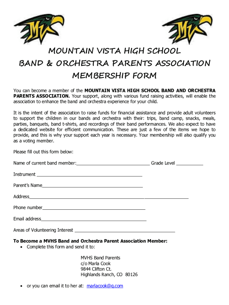 MOUNTAIN VISTA HIGH SCHOOL BAND & ORCHESTRA PARENTS ASSOCIATION MEMBERSHIP FORM You can become a member of the MOUNTAIN VISTA HIGH SCHOOL BAND AND ORCHESTRA PARENTS ASSOCIATION. Your support, along