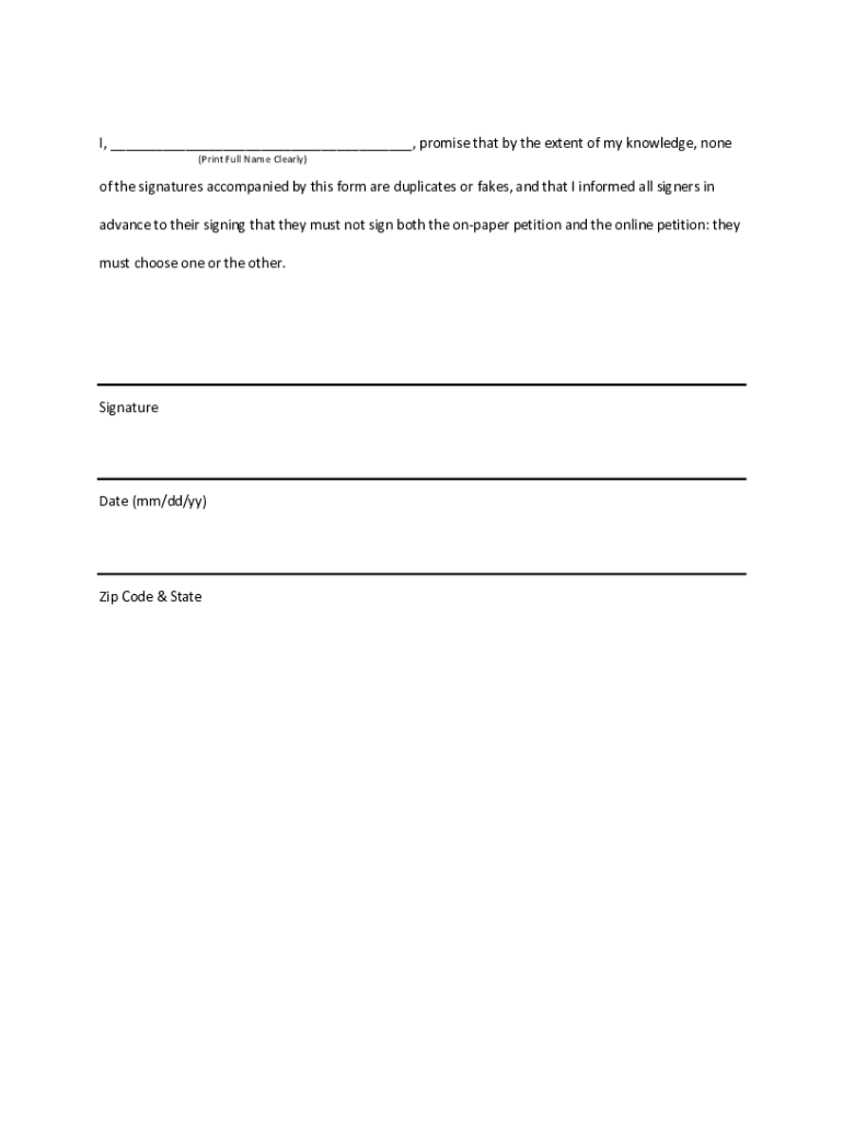 I, promise that by the extent of my knowledge, none (Print Full Name Clearly)of the signatures accompanied by this form are duplicates or fakes, and that I informed all signers in advance to their