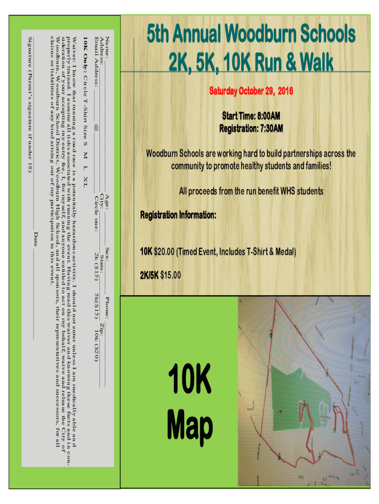 Saturday, October 29, 2016, Start Time: 8:00AM Registration: 7:30AMWoodburn Schools are working hard to build partnerships across the community to promote healthy students and families! All proceeds