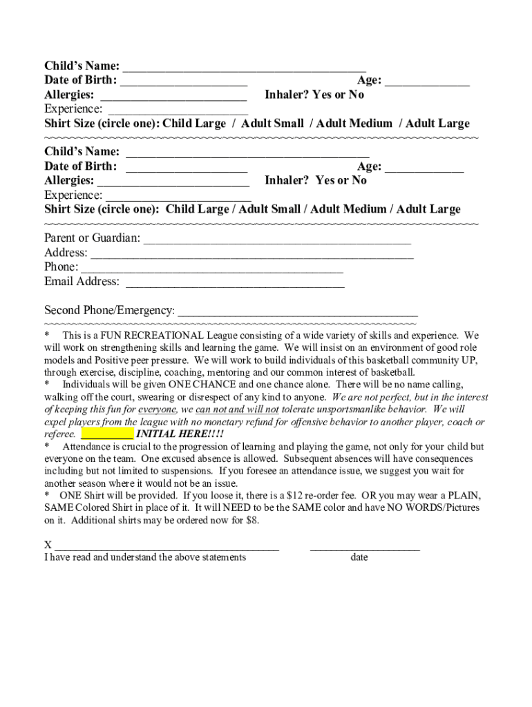 Child's Name: Date of Birth: Age: Allergies: Inhaler? Yes or No Experience: Shirt Size (circle one): Child Large / Adult Small / Adult Medium / Adult Large Child's Name: Date of Birth: Age: Allergies: