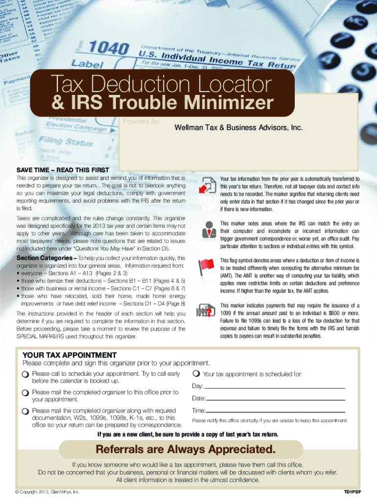 Tax Deduction Locator IRS Trouble Minimizer Provided By:Hellman Tax & Business Advisors, Inc. SAVE TIME READ THIS FIRST This organizer is designed to assist and remind you of information that is needed