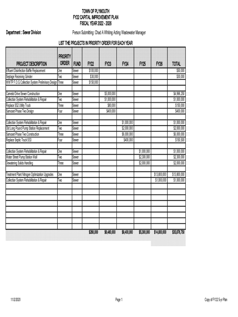 TOWN OF PLYMOUTH FY22 CAPITAL IMPROVEMENT PLAN FISCAL YEAR 2022 2026 Department : Sewer DivisionPerson Submitting: Chad A Whiting Acting Wastewater Manager LIST THE PROJECTS IN PRIORITY ORDER FOR