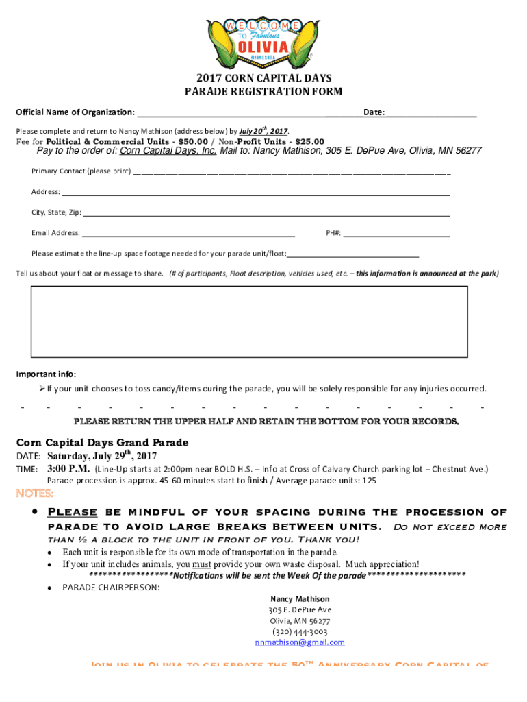 2017 CORN CAPITAL DISPARATE REGISTRATION Nonofficial Name of Organization: Date: Please complete and return to Nancy Matheson (address below) by July 20th, 2017. Fee for Political & Commercial Units