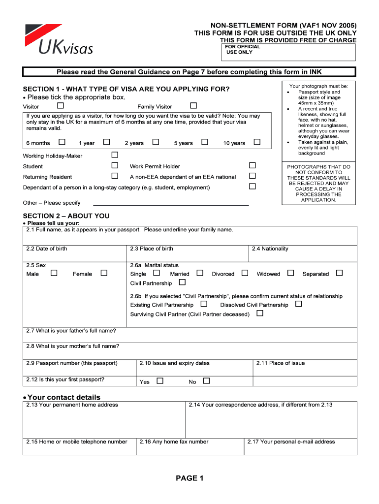 The UK Visa Application Form VAF1 is a visa application form used by individuals to apply for a visa to enter the United Kingdom for various purposes.