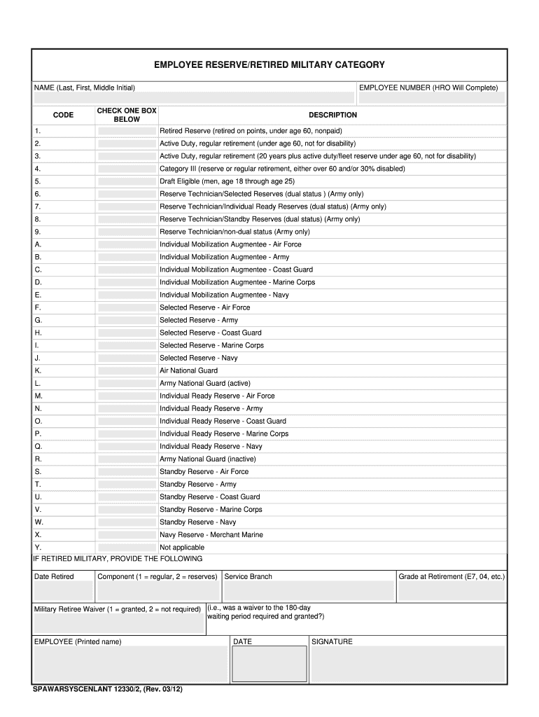 EMPLOYEE RESERVE/RETIRED MILITARY CATEGORY NAME (Last, First, Middle Initial) CODE EMPLOYEE NUMBER (PRO Will Complete) CHECK ONE BOX BELOW DESCRIPTION 1. Retired Reserve (retired on points, under