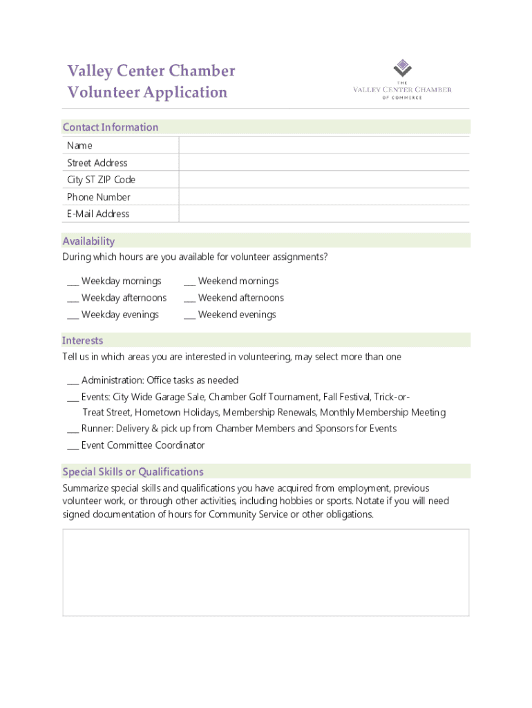 Valley Center Chamber Volunteer Application Contact Information Name Street Address City ST ZIP Code Phone Number Email AddressAvailability During which hours are you available for volunteer assignments?