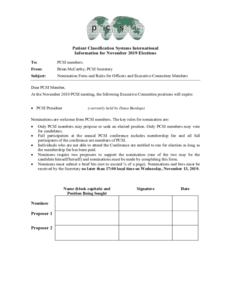 Patient Classification Systems International Information for November 2019 Elections To:PCSI membersFrom:Brian McCarthy, PCSI SecretarySubject:Nomination Form and Rules for Officers and Executive