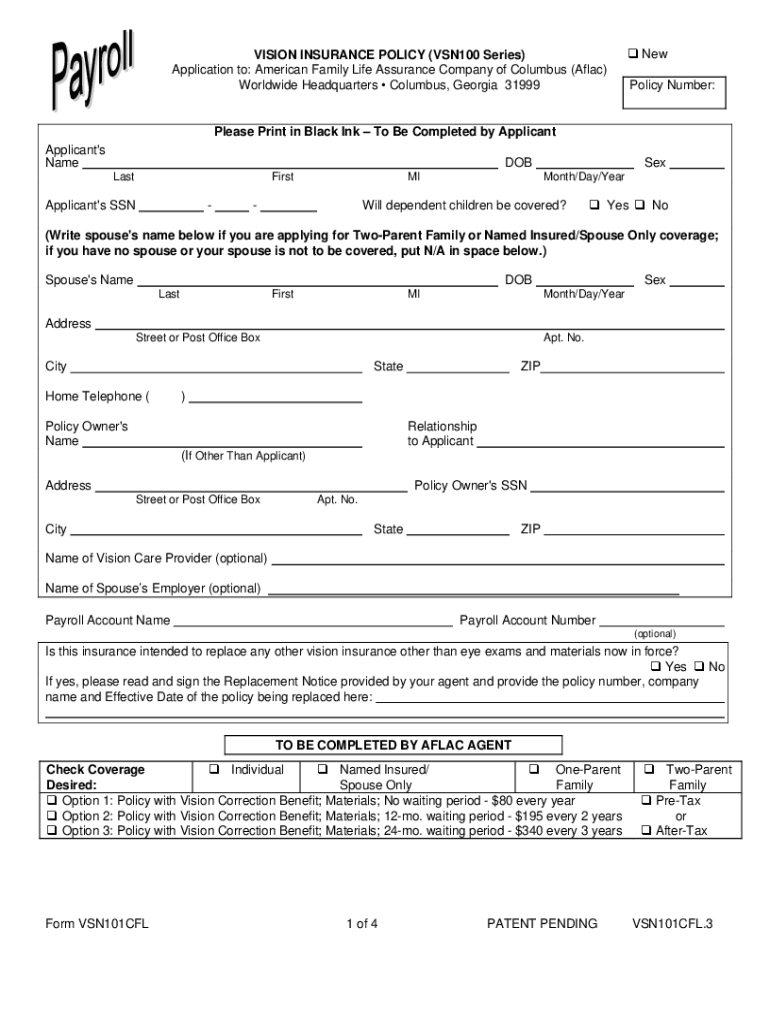 VISION INSURANCE POLICY (VSN100 Series) Application to: American Family Life Assurance Company of Columbus (Flag) Worldwide Headquarters Columbus, Georgia 31999 New Policy Number:Please Print in Black