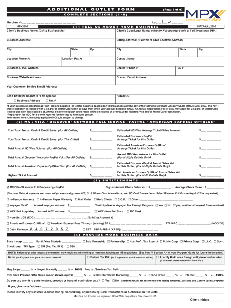 ADDITIONALOUTLETFORM(Page 1 of 6)COMPLETE SECTIONS (18)1 of Merchant #: LOC. MPXAddLo2202 MPX2202 (1) T E L L U S A B O U T YO U R B U S I N E S Clients Business Name: (Doing Business As) Clients