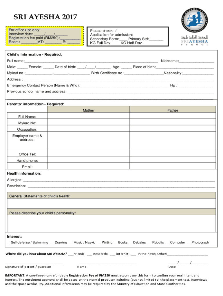 SRI AYESHA 2017 For office use only: Interview date: / / Registration fee paid (RM250): Room: MT: R: Please check: Application for admission: Secondary Form: Primary Std: KG Full Day KG Halfway Child's