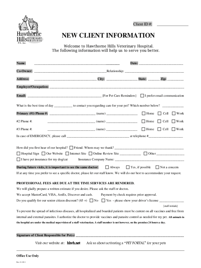 Client ID #: NEW CLIENT INFORMATION P.S., Inc. Name:Welcome to Hawthorne Hills Veterinary Hospital. The following information will help us to serve you better. Date: Corner: Relationship: Address: