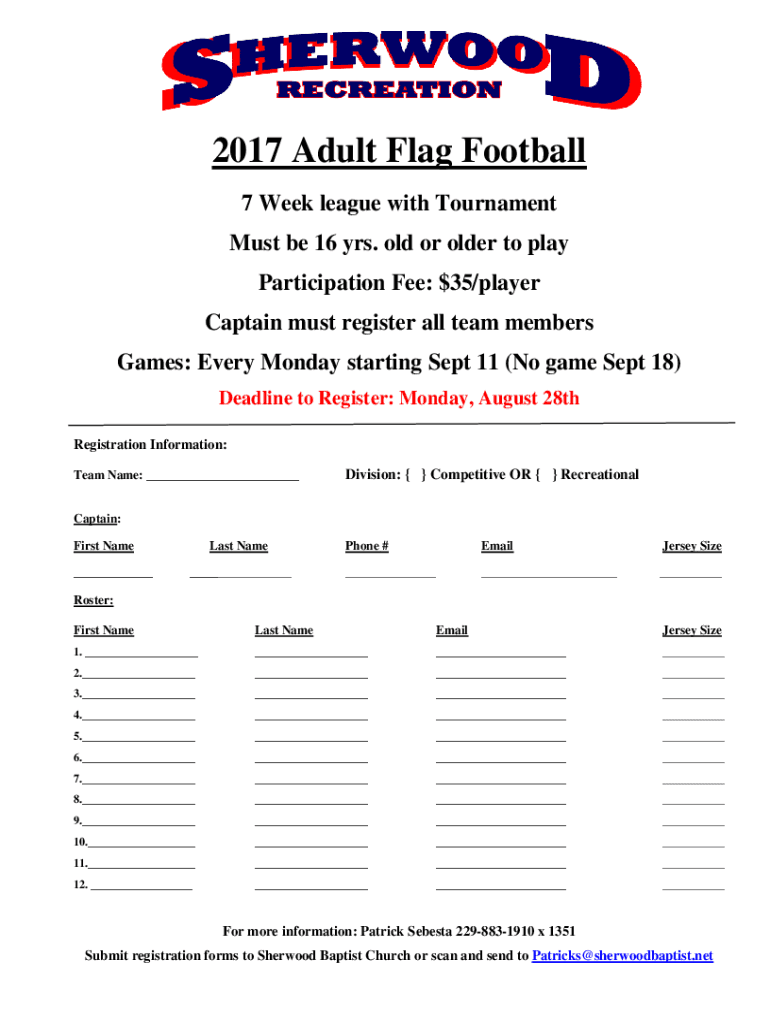 2017 Adult Flag Football 7 Week league with Tournament Must be 16 yrs. Old or older to play Participation Fee: $35/player Captain must register all team members Games: Every Monday starting Sept 11