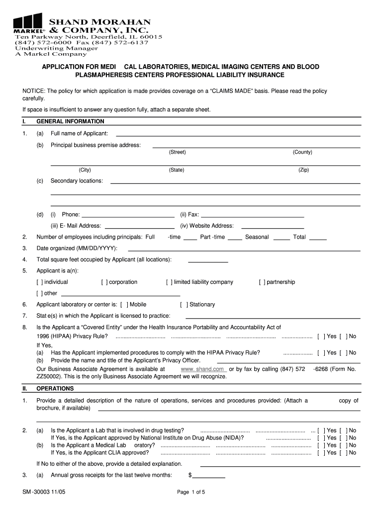The Medical Lab Professional Liability Insurance Application is a business form used by medical laboratories and imaging centers to apply for professional liability insurance.