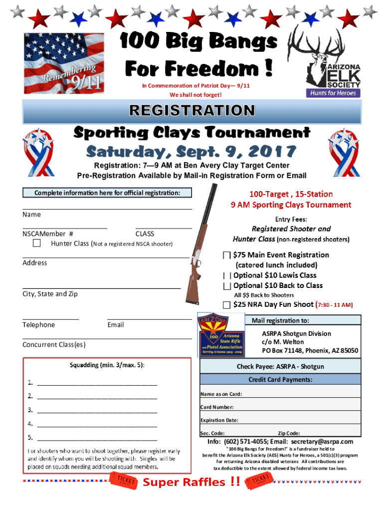 In Commemoration of Patriot Day 9/11 We shall not forget! Sporting Clays Tournament Saturday, Sept. 9, 2017 Registration: 79 AM at Ben Avery Clay Target Center Preregistration Available by Mailing