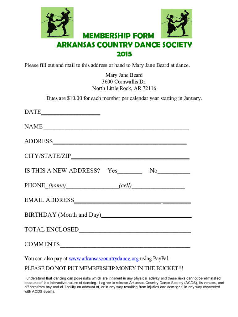 MEMBERSHIP FORM ARKANSAS COUNTRY DANCE SOCIETY 2015 Please fill out and mail to this address or hand to Mary Jane Beard at dance. Mary Jane Beard 3600 Cornwallis Dr. North Little Rock, AR 72116 Dues