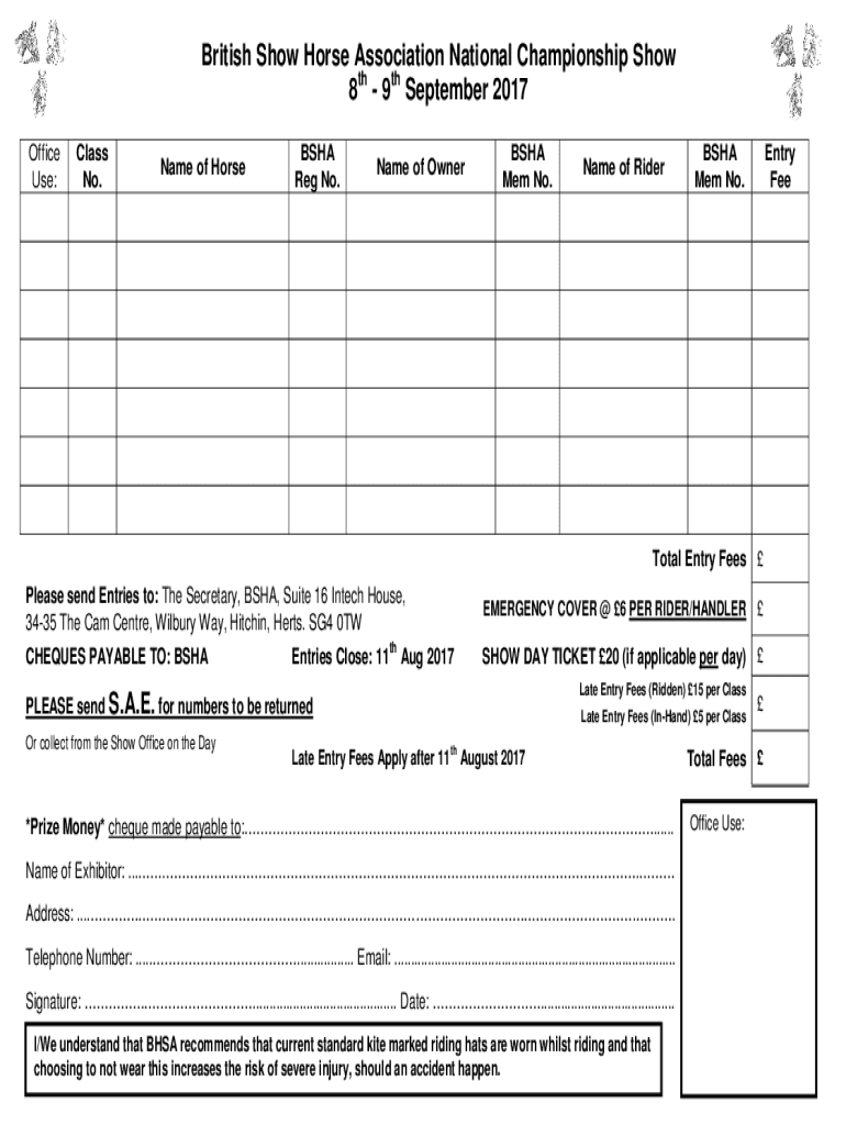 British Show Horse Association National Championship Show 8th 9th September 2017 Office Use:Class No. Name of Horses Reg No. Name of Owners Me No. Name of Riders Me No. Entry Teetotal Entry Fees Please
