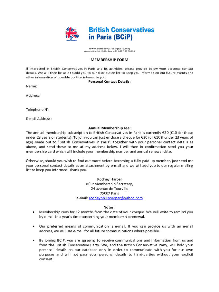 Get the free MEMBERSHIP FORM - British Conservatives in Paris
