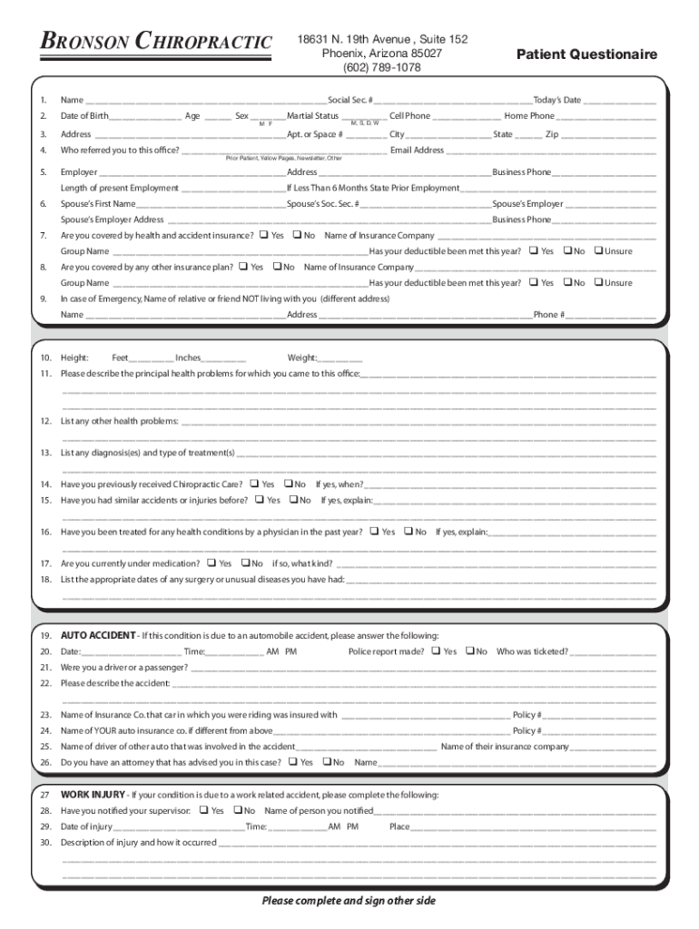 Bronson Chiropractic18631 N. 19th Avenue, Suite 152 Phoenix, Arizona 85027 (602) 7891078Patient Questionaire1. Name Social Sec. # Today's Date 2. Date of Birth Age Sex Martial Status Cell Phone Home