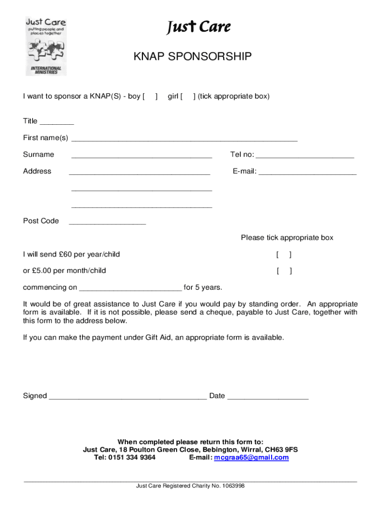 Just Care SNAP SPONSORSHIP want to sponsor a SNAP(S) boy girl (tick appropriate box)Title First name(s) Surname Tel no: Address Email: Post Code Please tick appropriate box will send 60 per year/child