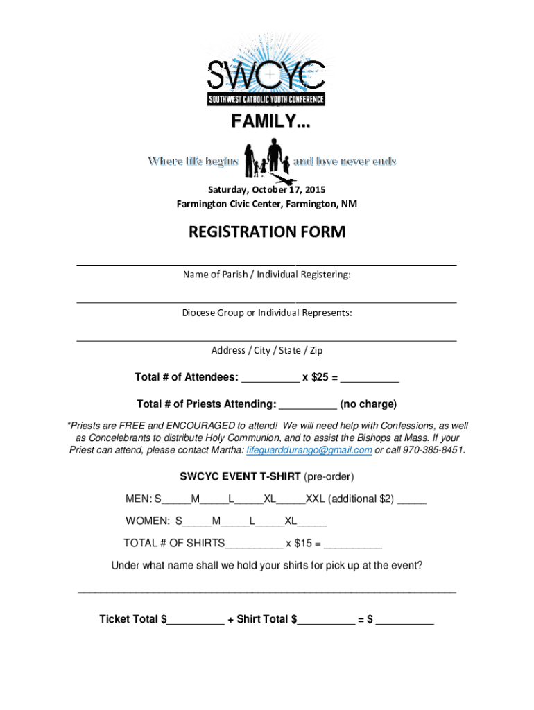 FAMILY... Saturday, October 17, 2015, Farmington Civic Center, Farmington, REGISTRATION FORM Name of Parish / Individual Registering: Diocese Group or Individual Represents: Address / City / State