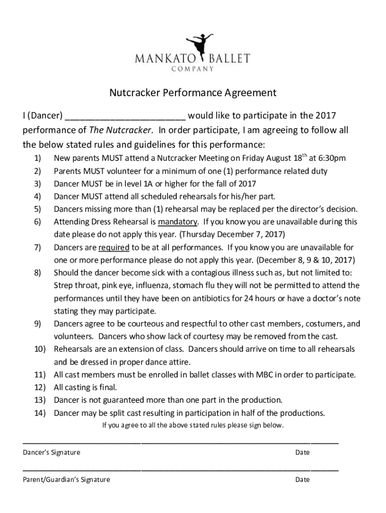 Nutcracker Performance Agreement I (Dancer) would like to participate in the 2017 performance of The Nutcracker. In order participate, I am agreeing to follow all the below stated rules and guidelines