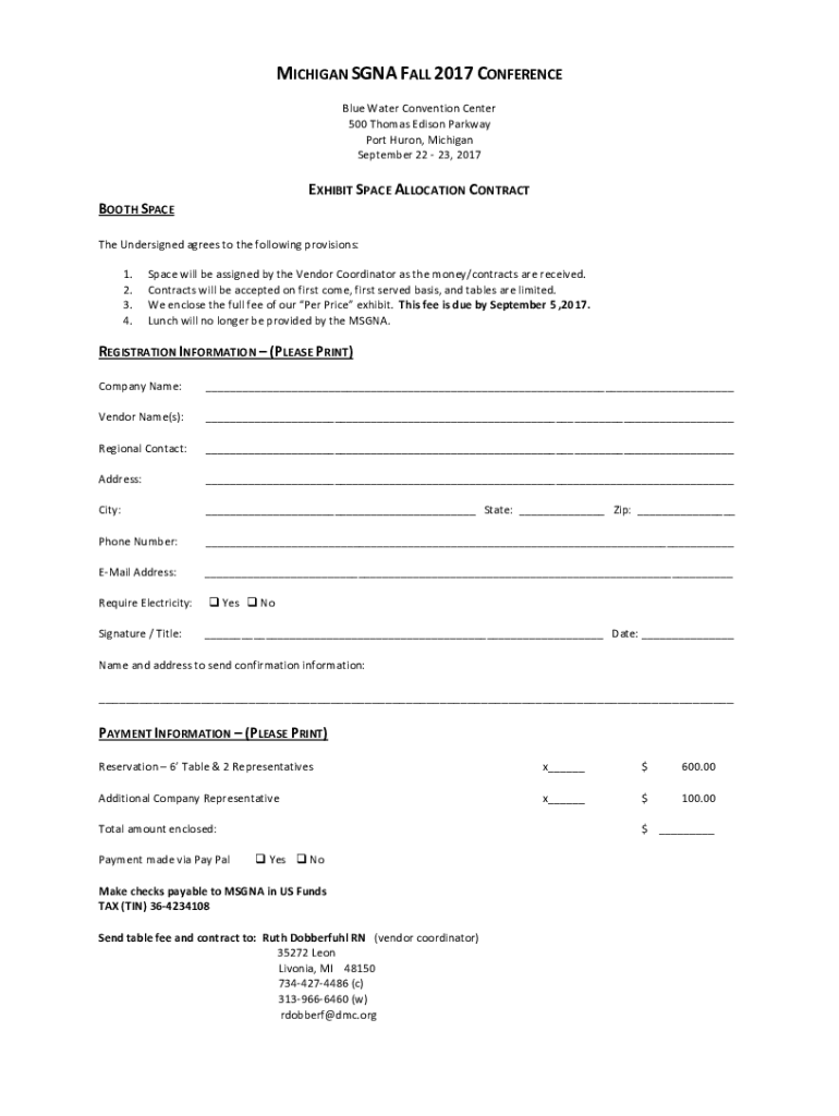 MICHIGAN SGA FALL 2017 CONFERENCE Blue Water Convention Center 500 Thomas Edison Parkway Port Huron, Michigan September 22 23, 2017EXHIBIT SPACE ALLOCATION CONTRACTBOOTH Spacetime Undersigned agrees