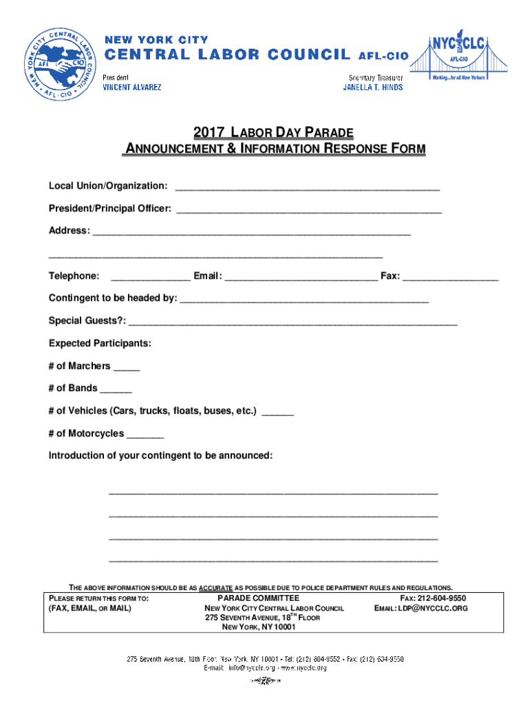 2017 LABOR DAY PARADE ANNOUNCEMENT & INFORMATION RESPONSE FORM Local Union/Organization: President/Principal Officer: Address: Telephone: Email: Fax: Contingent to be headed by: Special Guests?: Expected