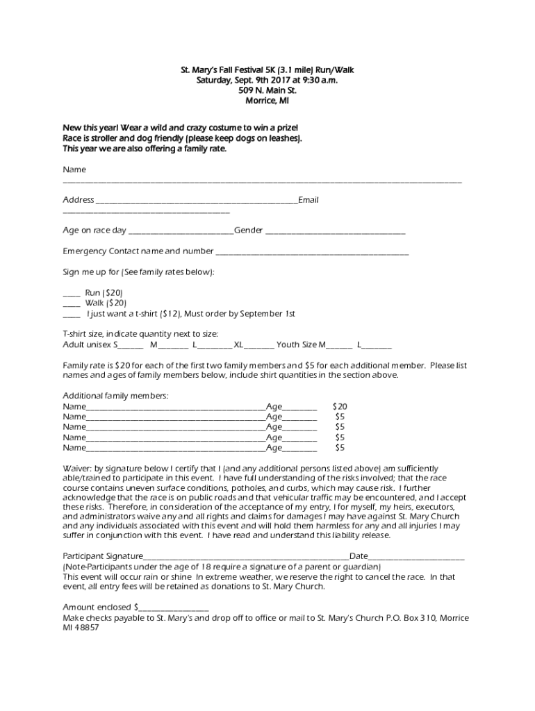 St. Mary's Fall Festival 5K (3.1 mile) Run/Walk Saturday, Sept. 9th 2017 at 9:30 a.m. 509 N. Main St. Morris, MI New this year! Wear a wild and crazy costume to win a prize! Race is stroller and dog
