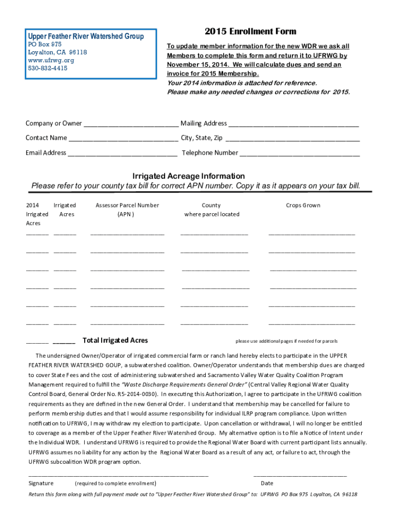 Upper Feather River Watershed Group PO Box 975 Loyal ton, CA 96118 www.ufrwg.org 53083244152015 Enrollment Form To update member information for the new WAR we ask all Members to complete this form
