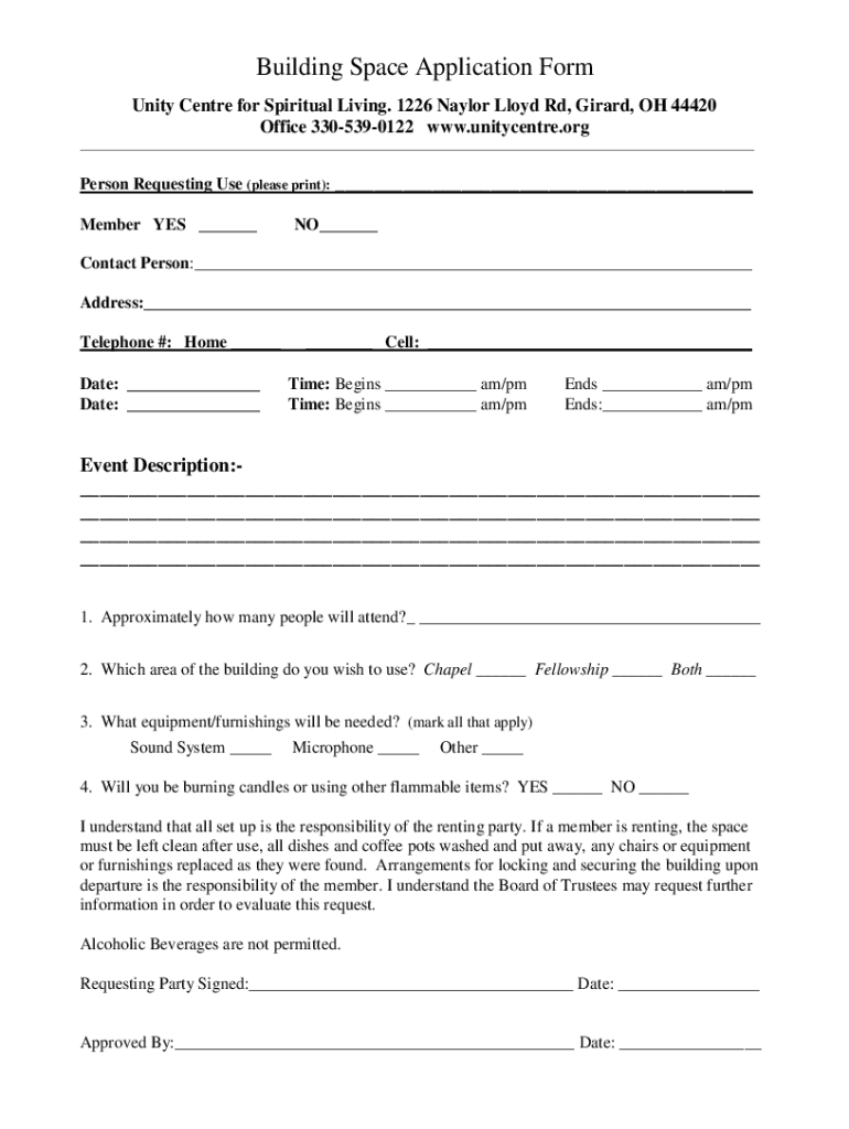 Building Space Application Form Unity Center for Spiritual Living. 1226 Naylor Lloyd Rd, Girard, OH 44420 Office 3305390122 www.unitycentre.org Person Requesting Use (please print): Member YES NO
