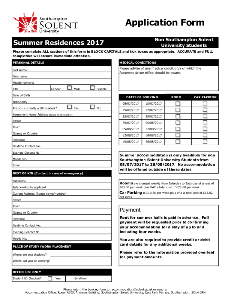 University Students Summer Residences 2017Please complete ALL sections of this form in BLOCK CAPITALS and tick boxes as appropriate. ACCURATE and FULL