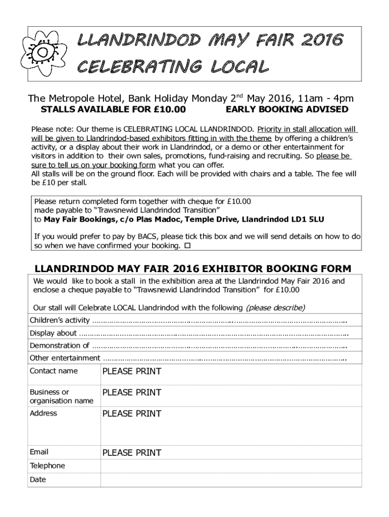 LLANDRINDOD MAY FAIR 2016CELEBRATING LOCAL The Metro pole Hotel, Bank Holiday Monday 2nd May 2016, 11am 4pm STALLS AVAILABLE FOR 10.00EARLY BOOKING ADVISEDPlease note: Our theme is CELEBRATING LOCAL