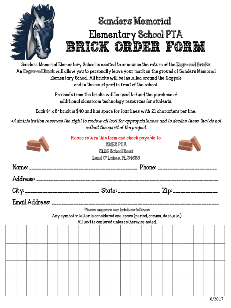 Get the free Brick Order Form - Sanders Memorial Elementary School - smes pasco k12 fl
