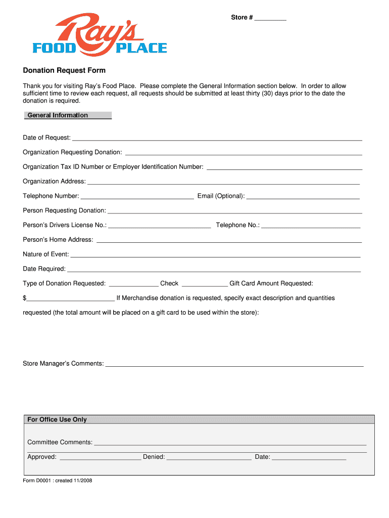 The Donation Request Form is a document used by non-profit organizations to request donations from Ray’s Food Place.