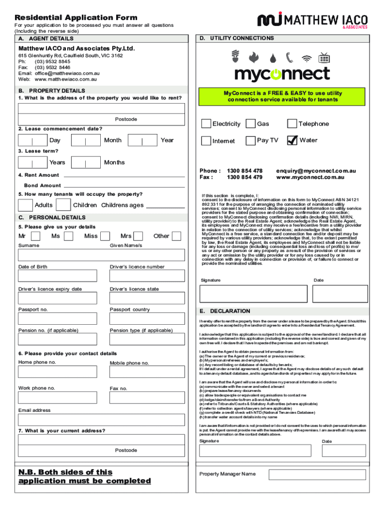 Residential Application Former your application to be processed you must answer all questions (Including the reverse side'd. UTILITY CONNECTIONS. AGENT DETAILS Matthew WACO and Associates Pty. Ltd.