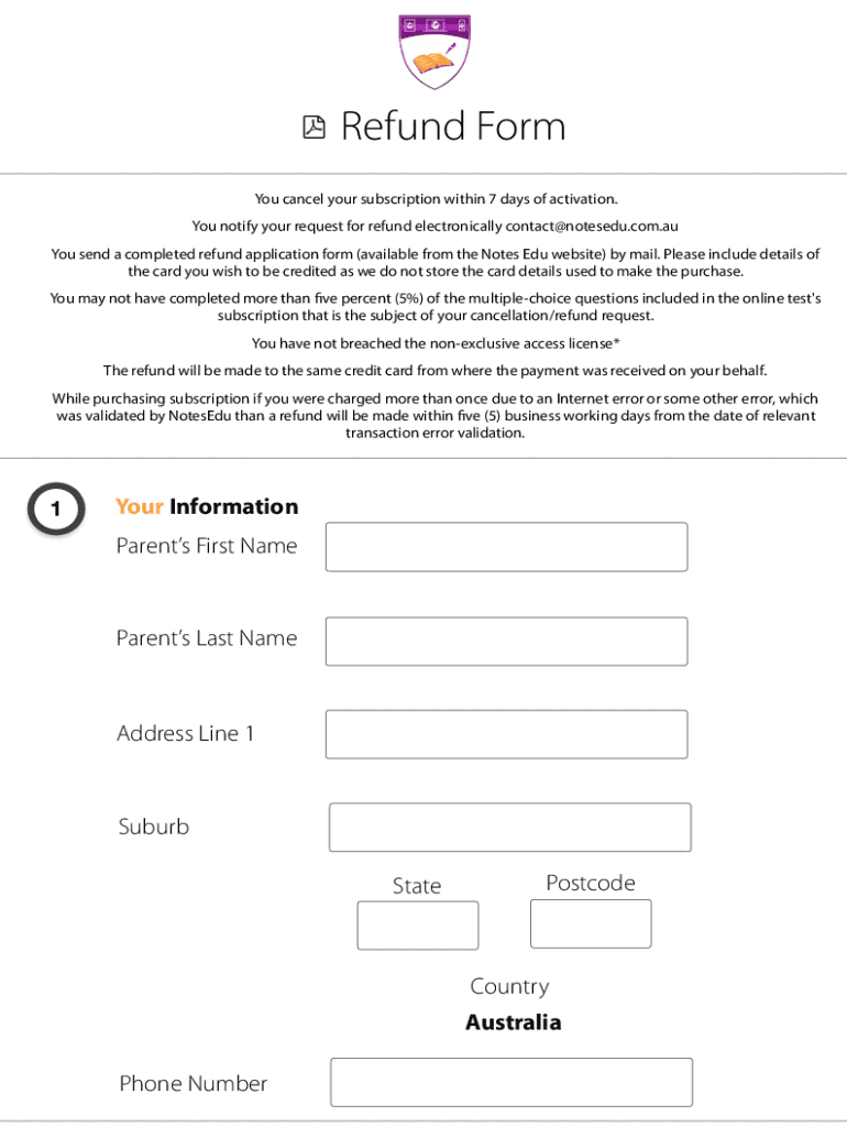 Refund Form You cancel your subscription within 7 days of activation. You notify your request for refund electronically contact notesedu.com.AU You send a completed refund application form (available