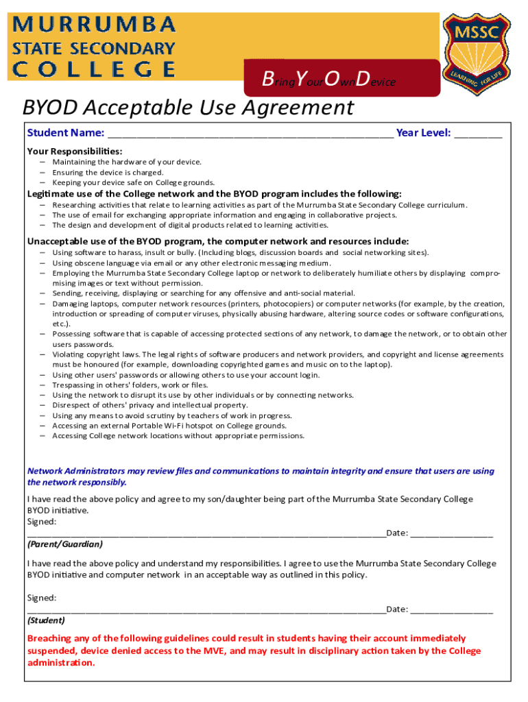 BringYourOwnDevice BYODAcceptableUseAgreement StudentName: Daredevil: YourResponsibili BS: Maintainingthehardwareofyourdevice. Ensuringthedeviceischarged. KeepingyourdevicesafeonCollegegrounds. Leg