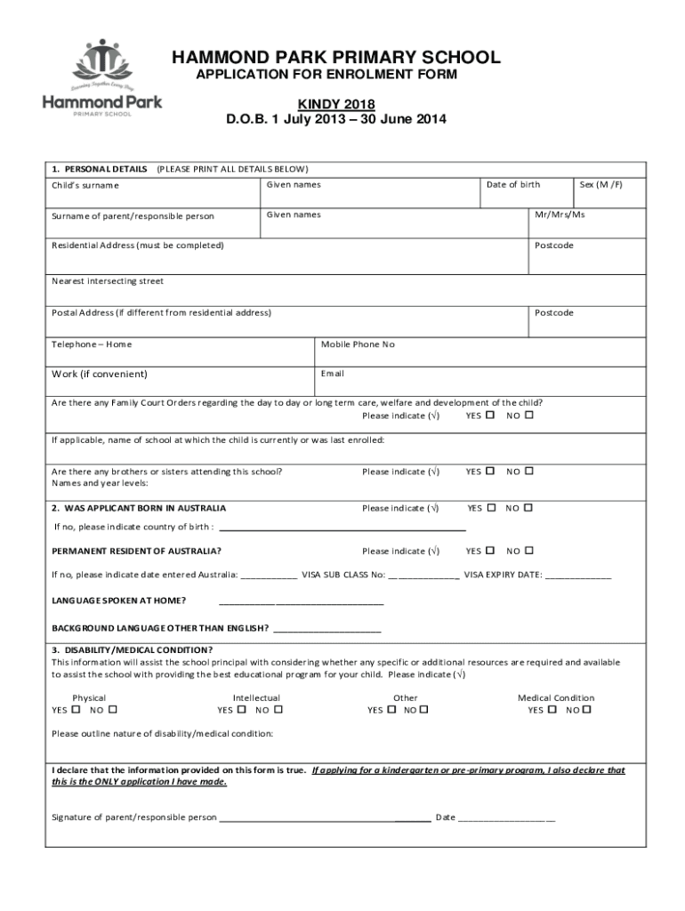 HAMMOND PARK PRIMARY SCHOOL APPLICATION FOR Enrollment FORM KIND 2018 D.O.B. 1 July 2013 30 June 20141. PERSONAL DETAILS (PLEASE PRINT ALL DETAILS BELOW) Child's surnameGiven namesSurname of parent/responsible