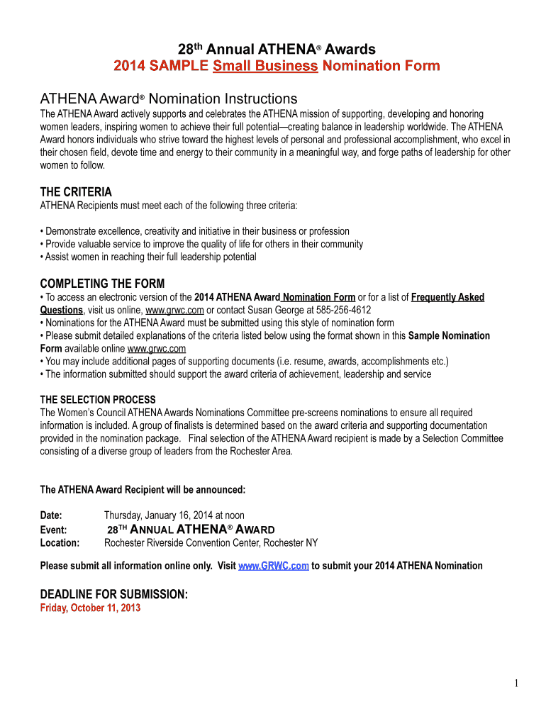 28th Annual ATHENA Awards 2014 SAMPLE Small Business Nomination Form ATHENA Award Nomination Instructions The ATHENA Award actively supports and celebrates the ATHENA mission of supporting, developing