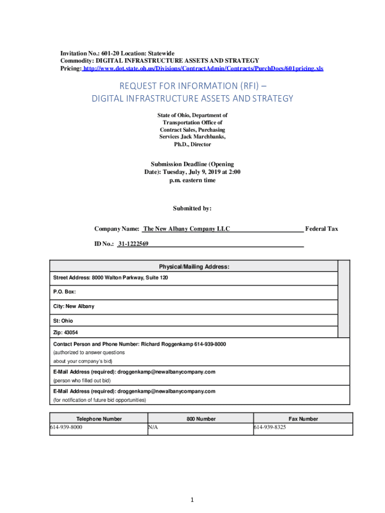 Invitation No.: 60120 Location: Statewide Commodity: DIGITAL INFRASTRUCTURE ASSETS AND STRATEGY Pricing: http://www.dot.state.oh.us/Divisions/ContractAdmin/Contracts/PurchDocs/601pricing.xlsREQUEST