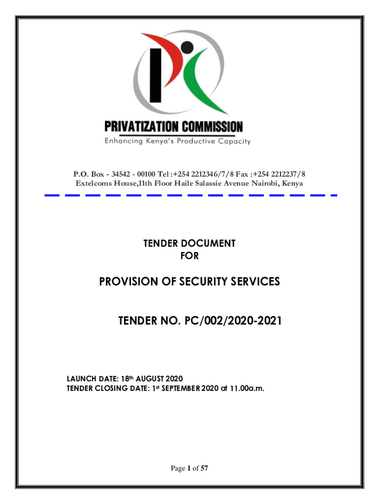 P.O. Box 34542 00100 Tel :+254 2212346/7/8 Fax :+254 2212237/8 Exteriors House,11th Floor Hail Selassie Avenue Nairobi, KenyaTENDER DOCUMENT PROVISION OF SECURITY SERVICES TENDER NO. PC/002/20202021LAUNCH
