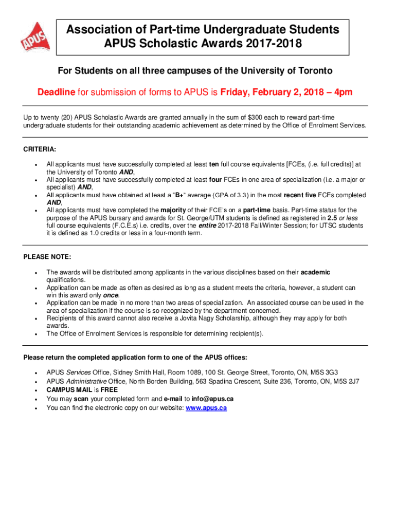 Association of Part time Undergraduate Students APES Scholastic Awards 20172018 For Students on all three campuses of the University of Toronto Deadline for submission of forms to APES is Friday,