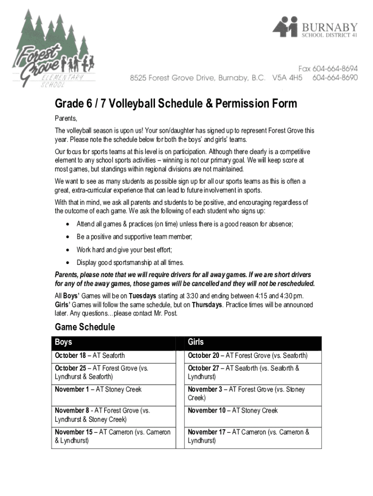 Grade 6 / 7 Volleyball Schedule & Permission Form Parents, The volleyball season is upon us! Your son/daughter has signed up to represent Forest Grove this year. Please note the schedule below for