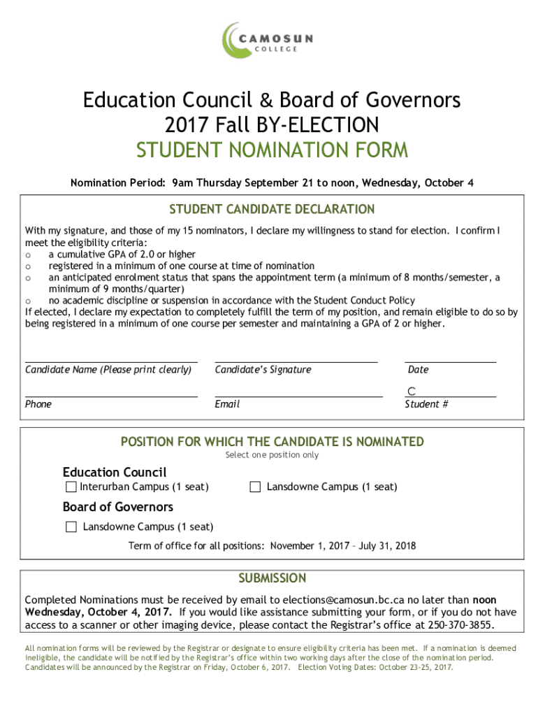 Education Council & Board of Governors 2017 Fall ELECTION STUDENT NOMINATION FORM Nomination Period: 9am Thursday, September 21 to noon, Wednesday, October 4STUDENT CANDIDATE DECLARATION With my signature,