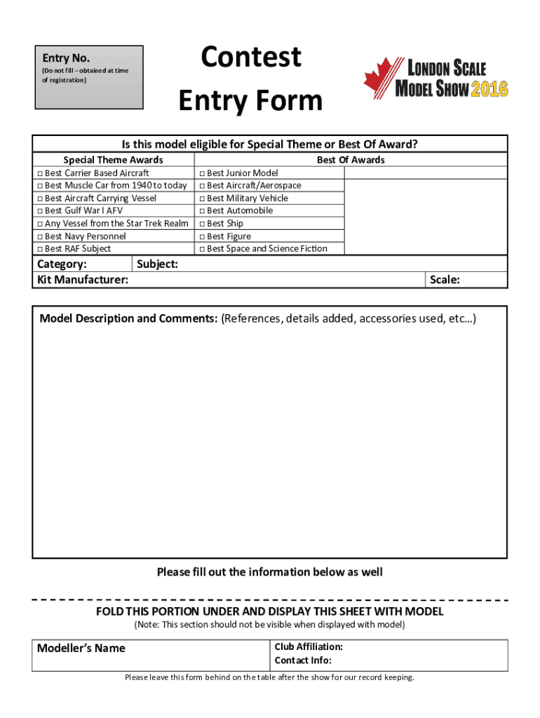 Contest Entry Forestry No. (Do not fill obtained at time of registration)Is this model eligible for Special Theme or Best Of Award? Special Theme Awards Best Carrier Based Aircraft Best Muscle Car